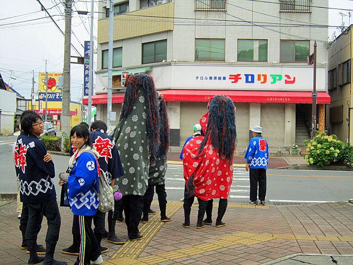 気合の一声を合図に、獅子は歯を打ち鳴らし、雄叫びを上げます。そうして神殿の周りを一周し、祇園神社から日吉神社に向かいます。塩振り・水撒きと呼ばれる先導の後を、赤の大、黒の大、赤の小、黒の小という順番で続きます。赤の大が一番大きく重く、黒の小が一番小さく軽い獅子です。赤の獅子が雄獅子であり、黒の獅子が雌獅子だと言われています。