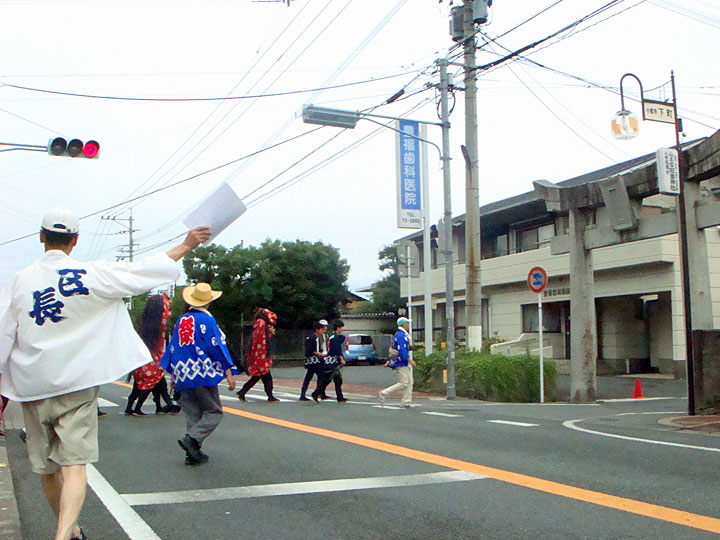 夕方になると、いよいよ終りが近づいてきます。この頃になると、疲労を通り越し、かえってハイになっています。また、祇園祭を終えた子供会の子供たちの一部も合流します。新町区を恙なく回ると、最後に駅前にまで進出します。