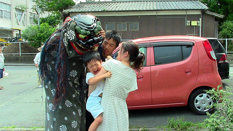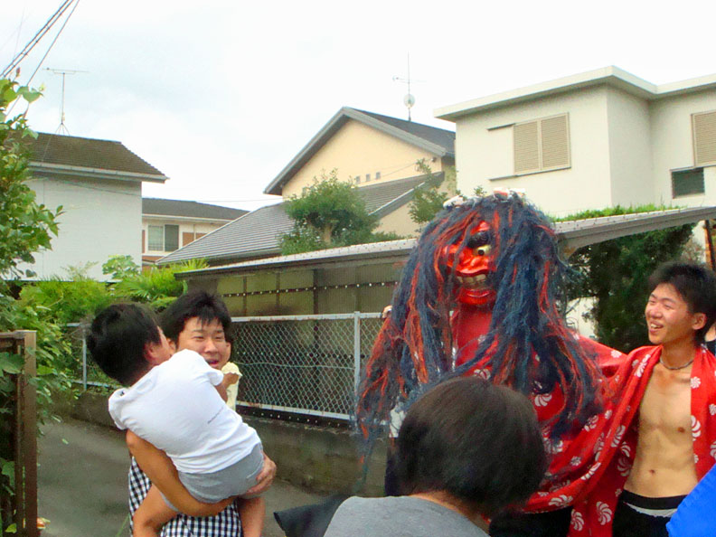 新町区公民館で子供会と交流します。獅子の迫力に、子供の中には泣きながら逃げ回る子も多くいます。それでも、子供たちは、「頭を噛んで下さい。」とお願いに来ます。獅子に頭を噛んでもらうと、その年は病気や怪我をしないなどと言われており、新町の子供たちはそれを知っているのです。