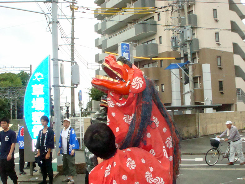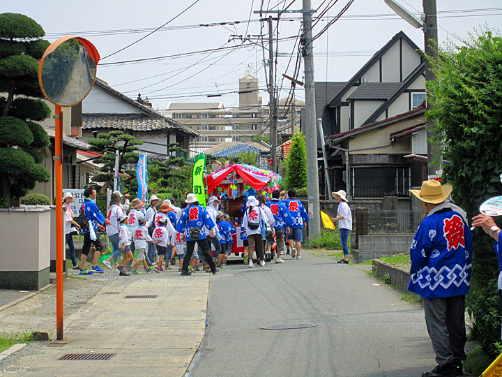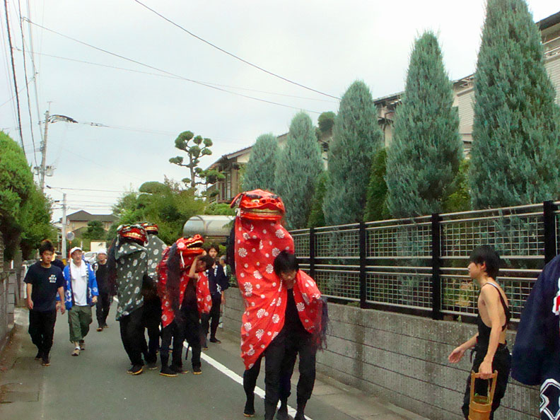 日吉神社から、東に向かい、ドラッグストアモリとヤマハ音楽教室の間の道から、新町区へ入ります。新町区に入って以降は、定期的に休憩を取りつつ各戸を回ります。重い獅子を担ぎ、炎天下の中走り回るため、細かな休憩を取らないと担ぎ手たちはとても一日持ちません。休憩所として自宅の一角を利用させて頂いたり、飲食物を提供して頂いたりと、地域の方の協力なくしては行えない祭りです。そうして、午前中は新町区の東側を中心に、回っていきます。