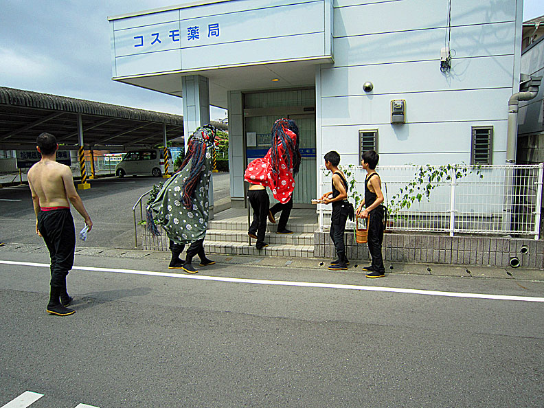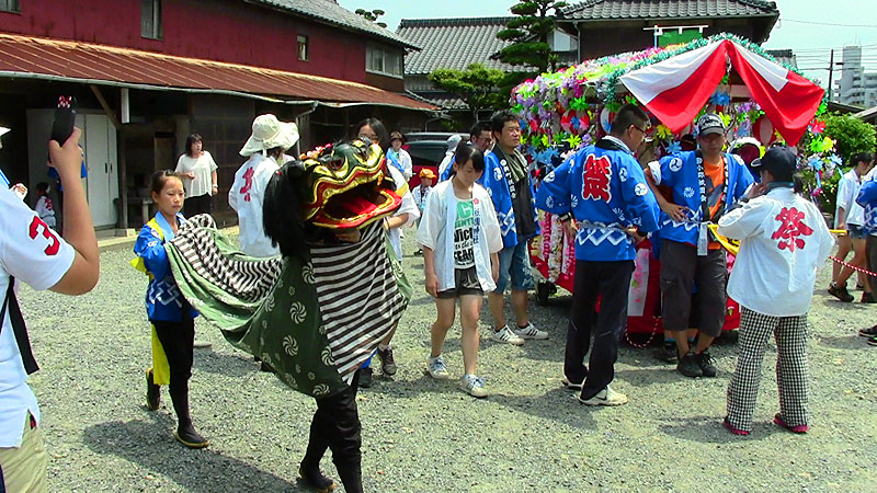 午後は、新町区の西側・南側を中心に回ります。日差しも強く、気温も上がり、さらに午前中の疲れもあるため、獅子はさらに過酷になっていきます。それでも担ぎ手たちは、声をあげ獅子を続けます。大きな声を出す、ということは、精神論のように聞こえるかもしれませんが、獅子をやる上では非常に重要です。声を出す、ということは即ち、気合を入れ緊張感を維持するということです。これだけ過酷な獅子ですから、緊張感が緩むことは事故や怪我につながりかねません。