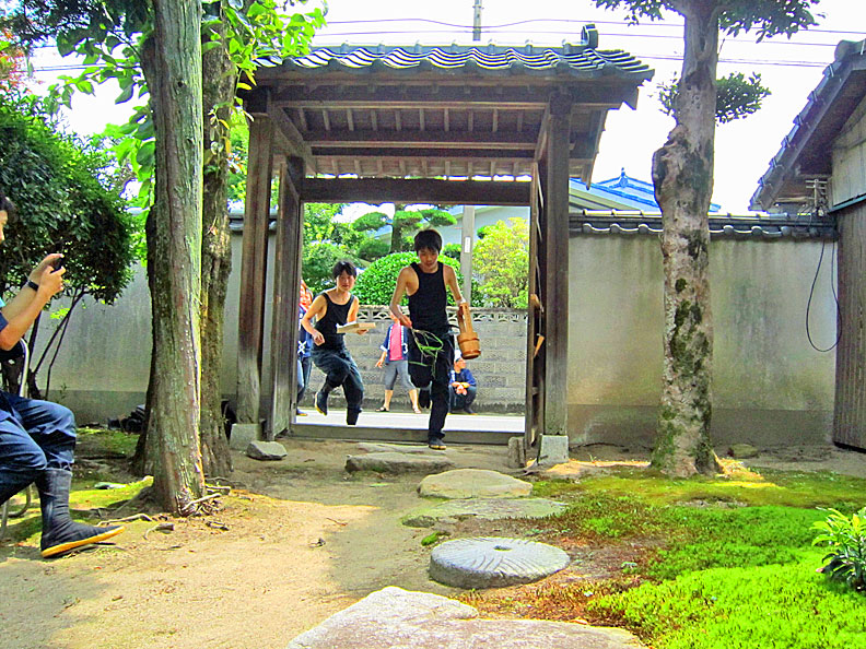 日吉神社まで、数mという所で、先導の塩振り・水撒きが走り出します。それを契機に、獅子たちも頭を振り、歯を打ち鳴らし、雄叫びを上げながら走り出します。そうして、祇園神社の時と同様、神殿の周りを一周すると、神殿の前で再度獅子の歯を打ち鳴らします。
